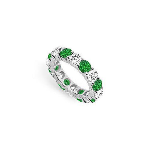 Lush-green emeralds alternate with brilliant-cut round diamonds in a 14K white gold prong-setting. This eternal circle symbolizes your never ending hope in life. This eternity band has a total gem weight (TGW) of 5.00 ct. Being a May birthstone; it makes a great gift for a May born.