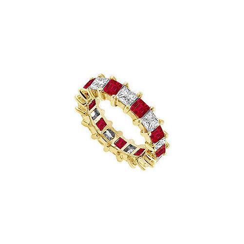 Creating a fine contrast of vibrant red and soothing white this vivacious eternity band is prong-set with alternating square rubies and princess-cut diamonds. Made in 14K yellow gold this eternity band has a total gem weight (TGW) of 5.00 ct. A perfect gift for any July born as Ruby is Julys birthstone.