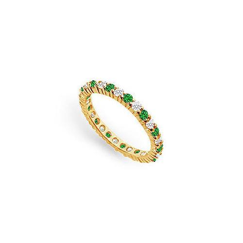 Lush-green emeralds alternate with brilliant-cut round diamonds in a 18K yellow gold prong-setting. This eternal circle symbolizes your never ending hope in life. This eternity band has a total gem weight (TGW) of 1.00 ct. Being a May birthstone; it makes a great gift for a May born.