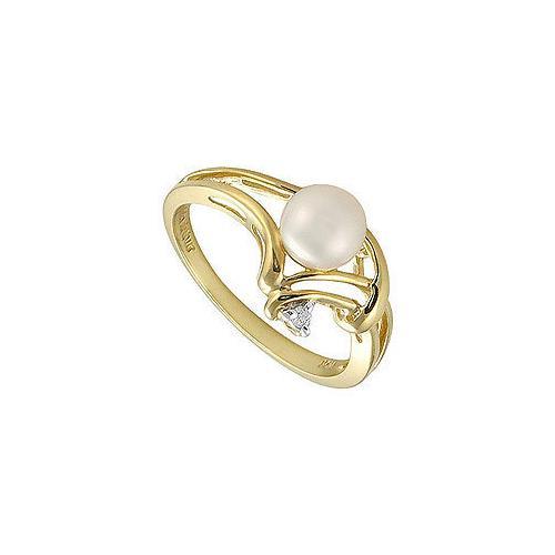 A round white freshwater cultured pearl is delicately set in the center & is accented with a small diamond. Swirl design creates a feminine look. This ring is made in 14K yellow gold.