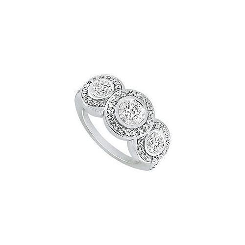 Three large brilliant-cut diamonds are bezel-set & encircled by smaller round diamonds. Rendered in rich platinum this engagement ring has a total weight (TDW) of 1.00 ct.