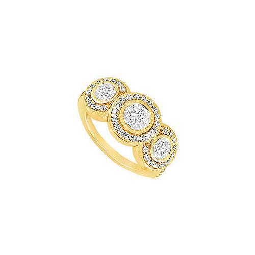 Three large brilliant-cut diamonds are bezel-set & encircled by smaller round diamonds. Made in 14K yellow gold this J1616AW14Dring has a total weight (TDW) of 1.00 ct.